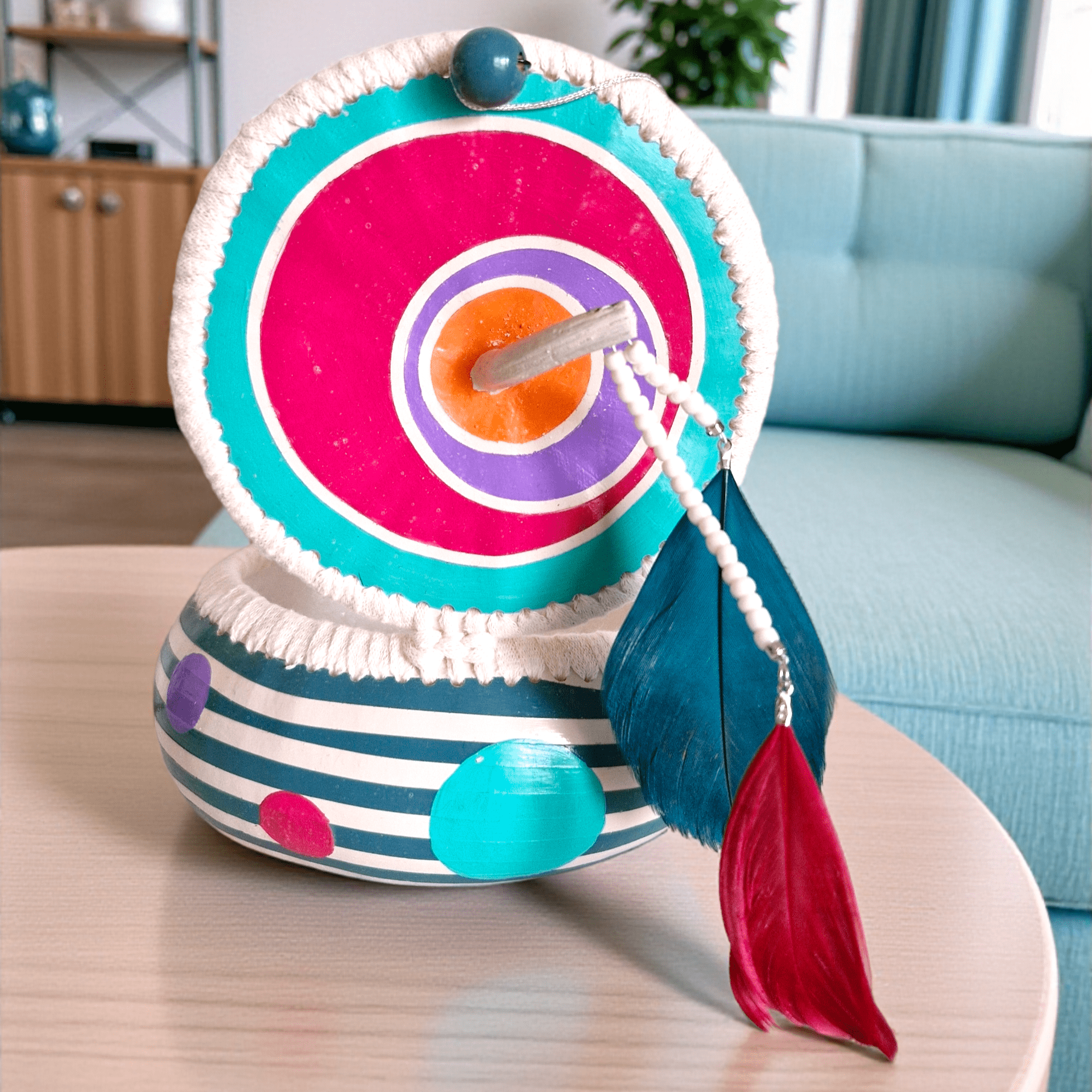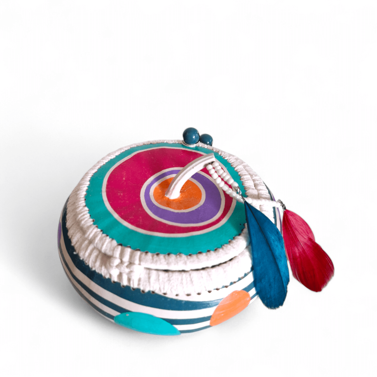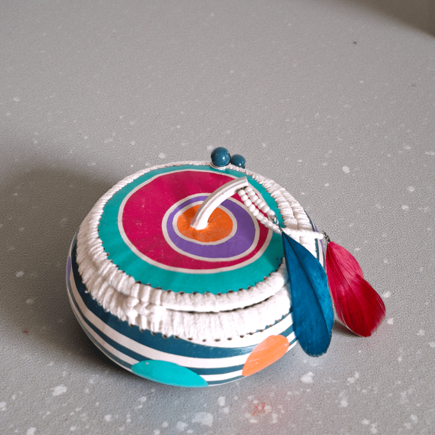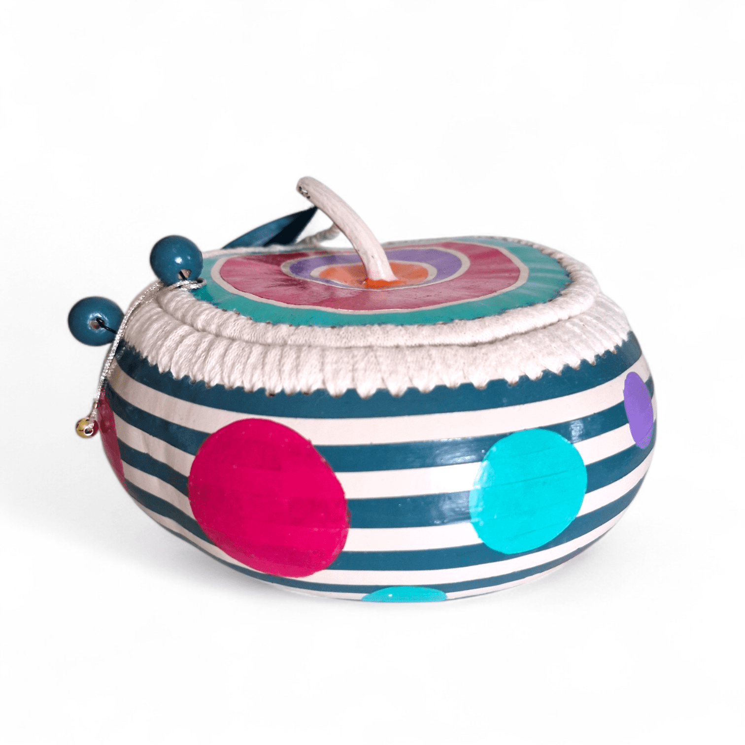 Jolie boîte en gourde-calebasse naturelle vidée, nettoyée, poncée, puis peinte à la main et vernie (vitrificateur brillant).