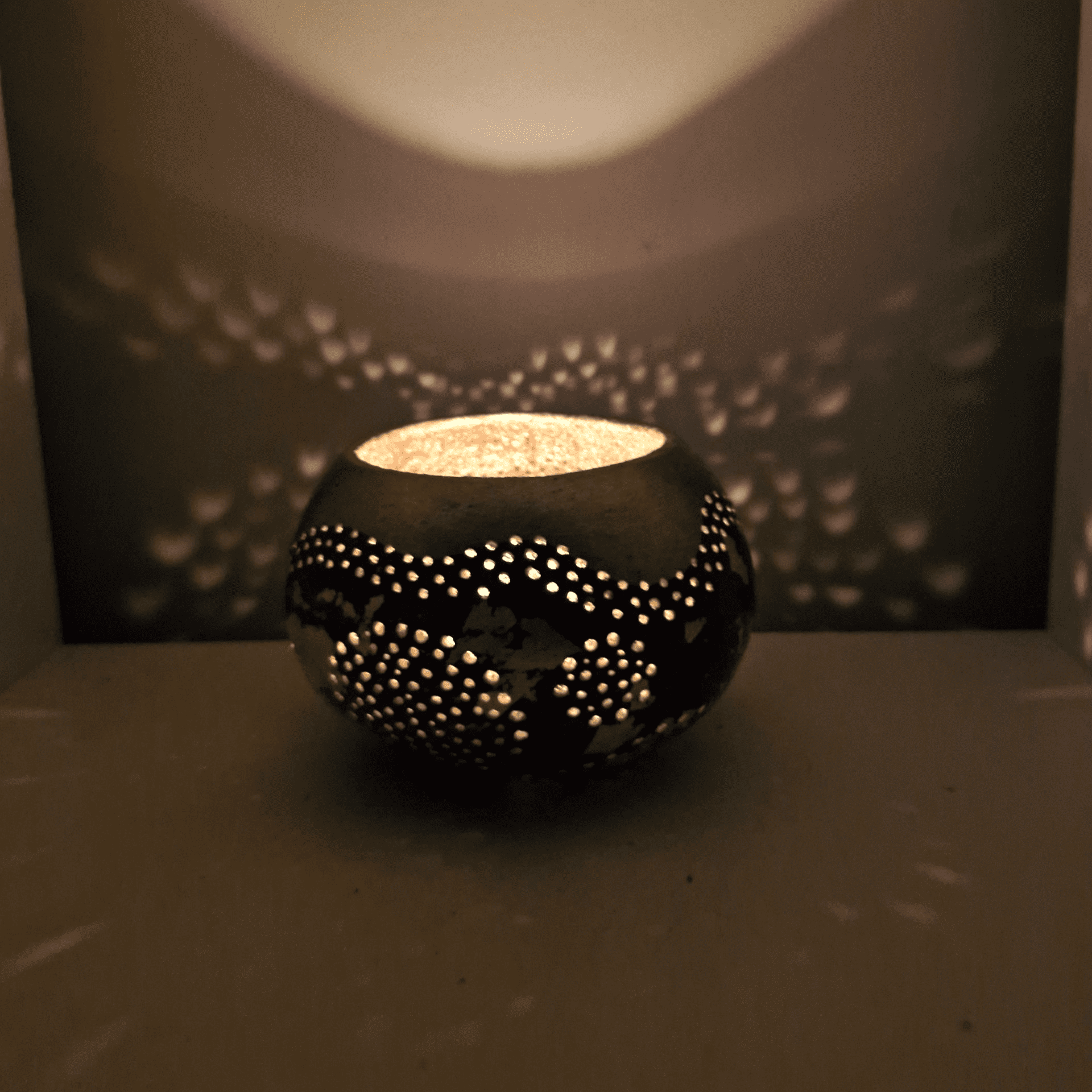 Les trous, percés un par un à l'aide d'une perceuse de précision, permettent à la lumière de la bougie de créer une ambiance douce et onirique.