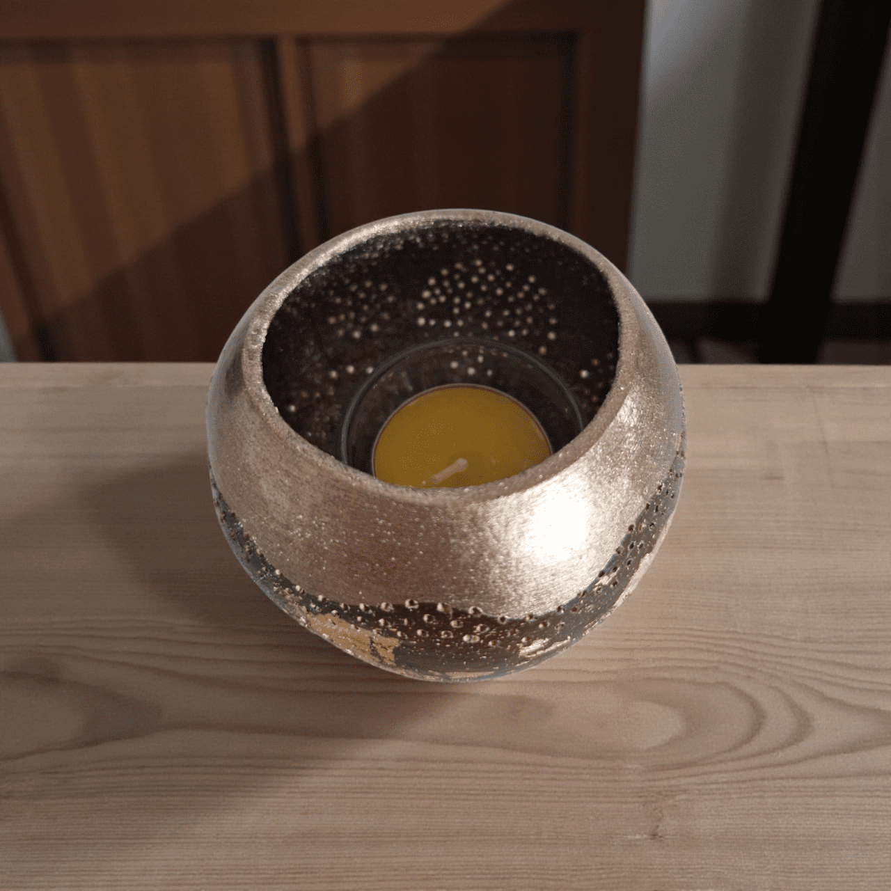 Un support en verre et une bougie chauffe-plat sont offerts avec le photophore.
