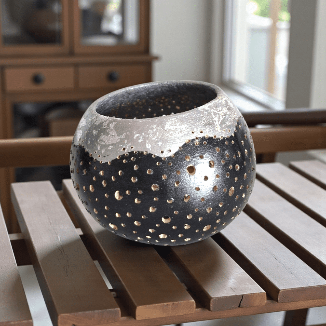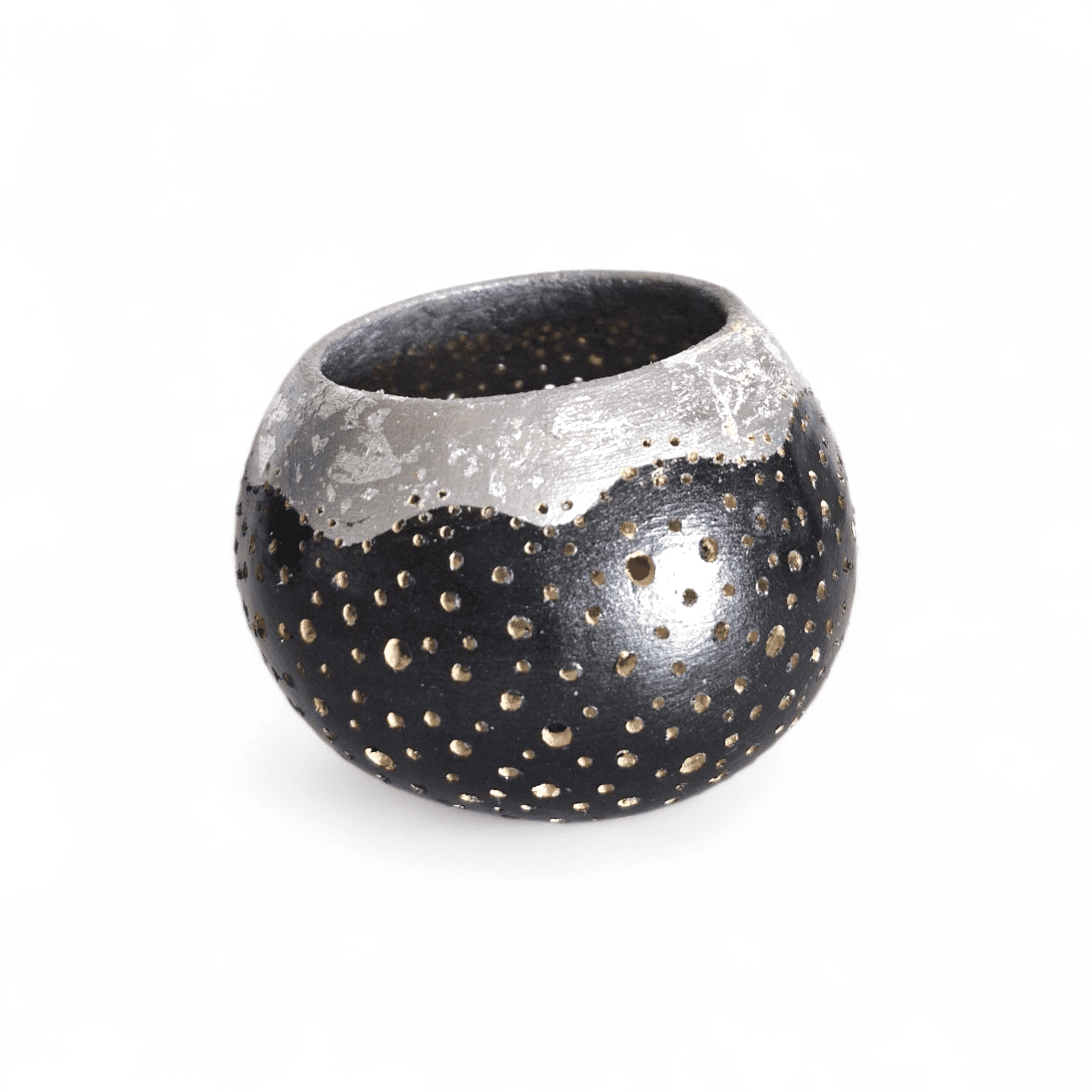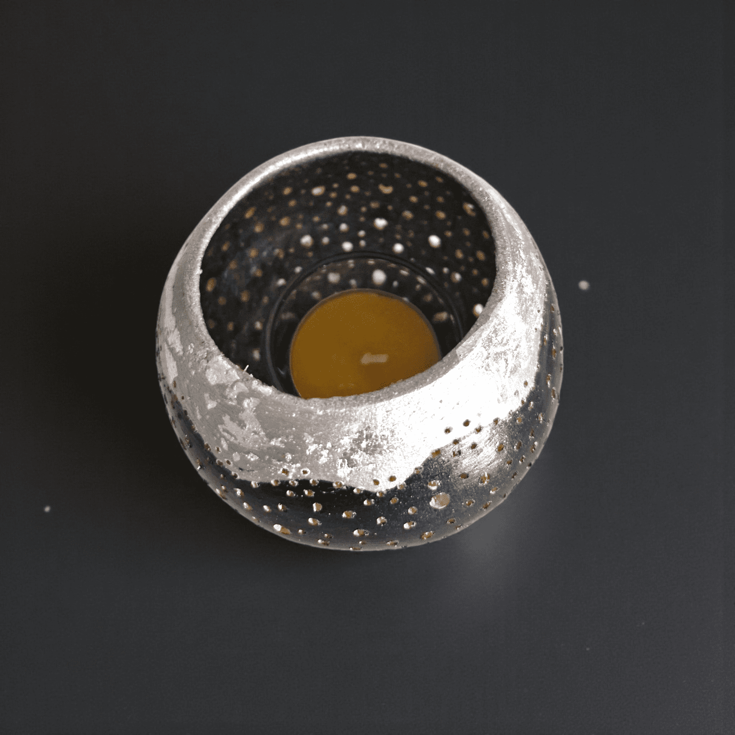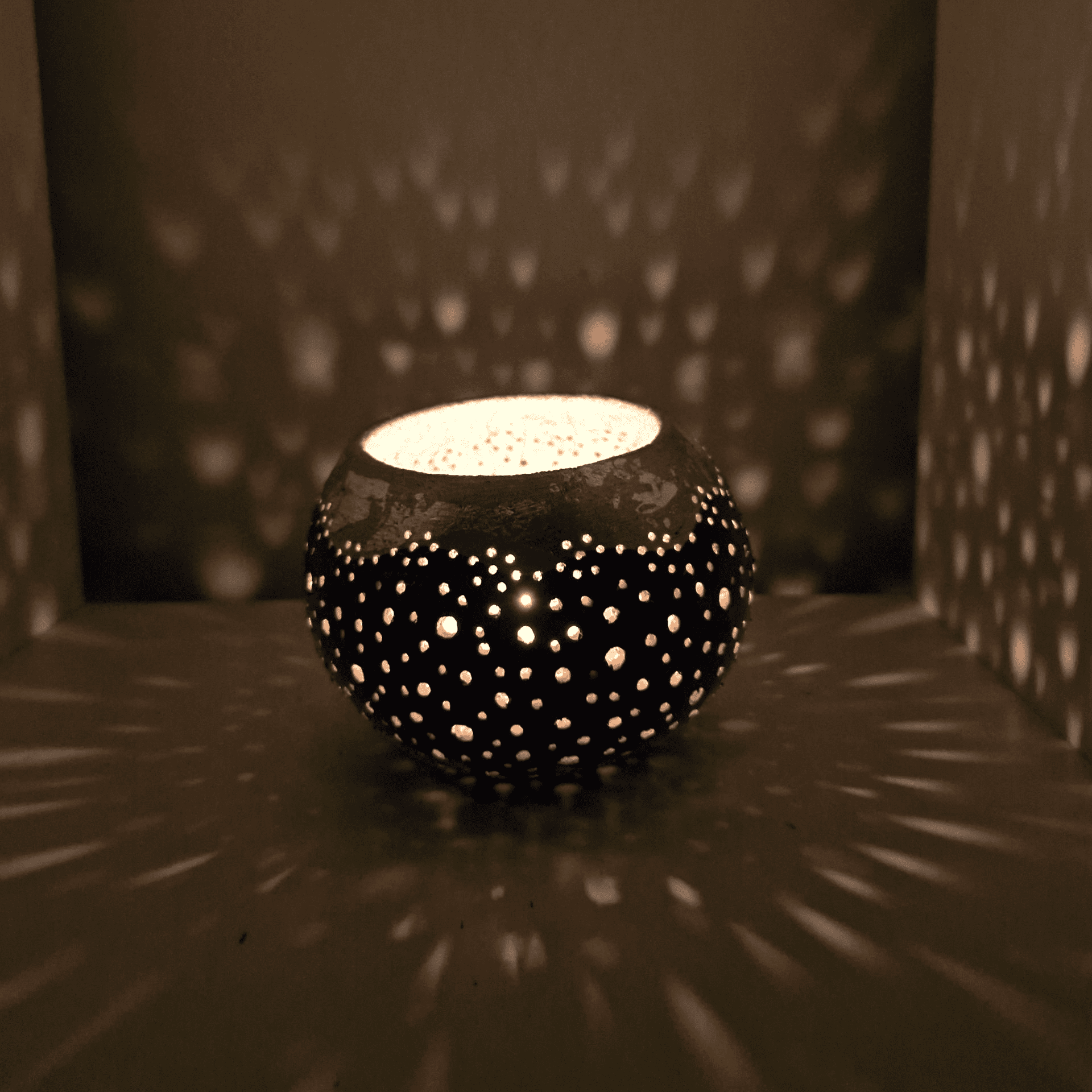 Les trous, percés un par un à l'aide d'une perceuse de précision, permettent à la lumière de la bougie de créer une ambiance douce et onirique.