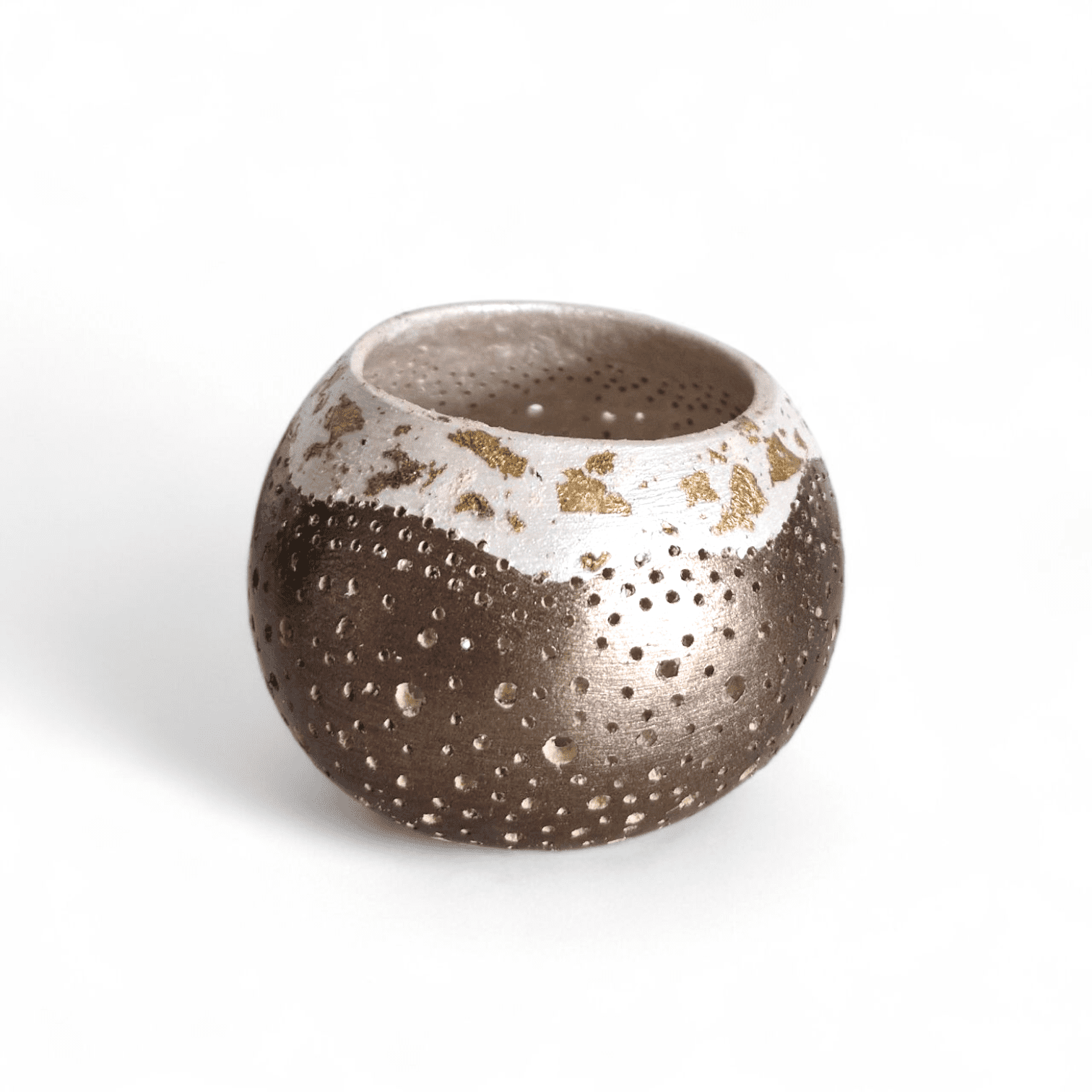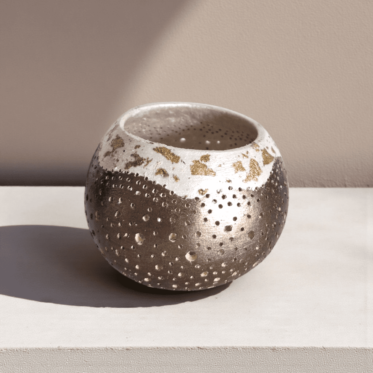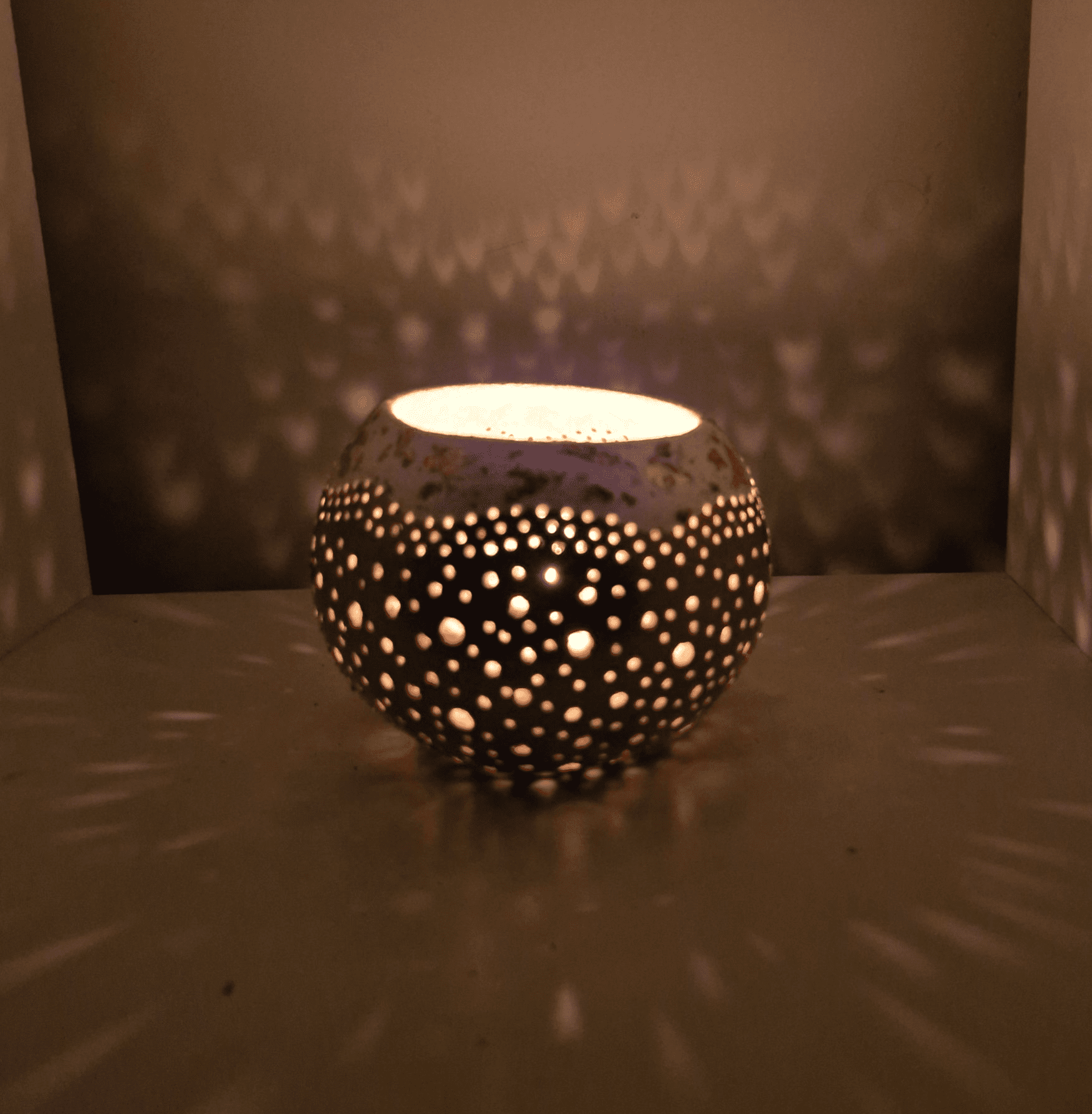 Les trous, percés un par un à l'aide d'une perceuse de précision, permettent à la lumière de la bougie de créer une ambiance douce et onirique.