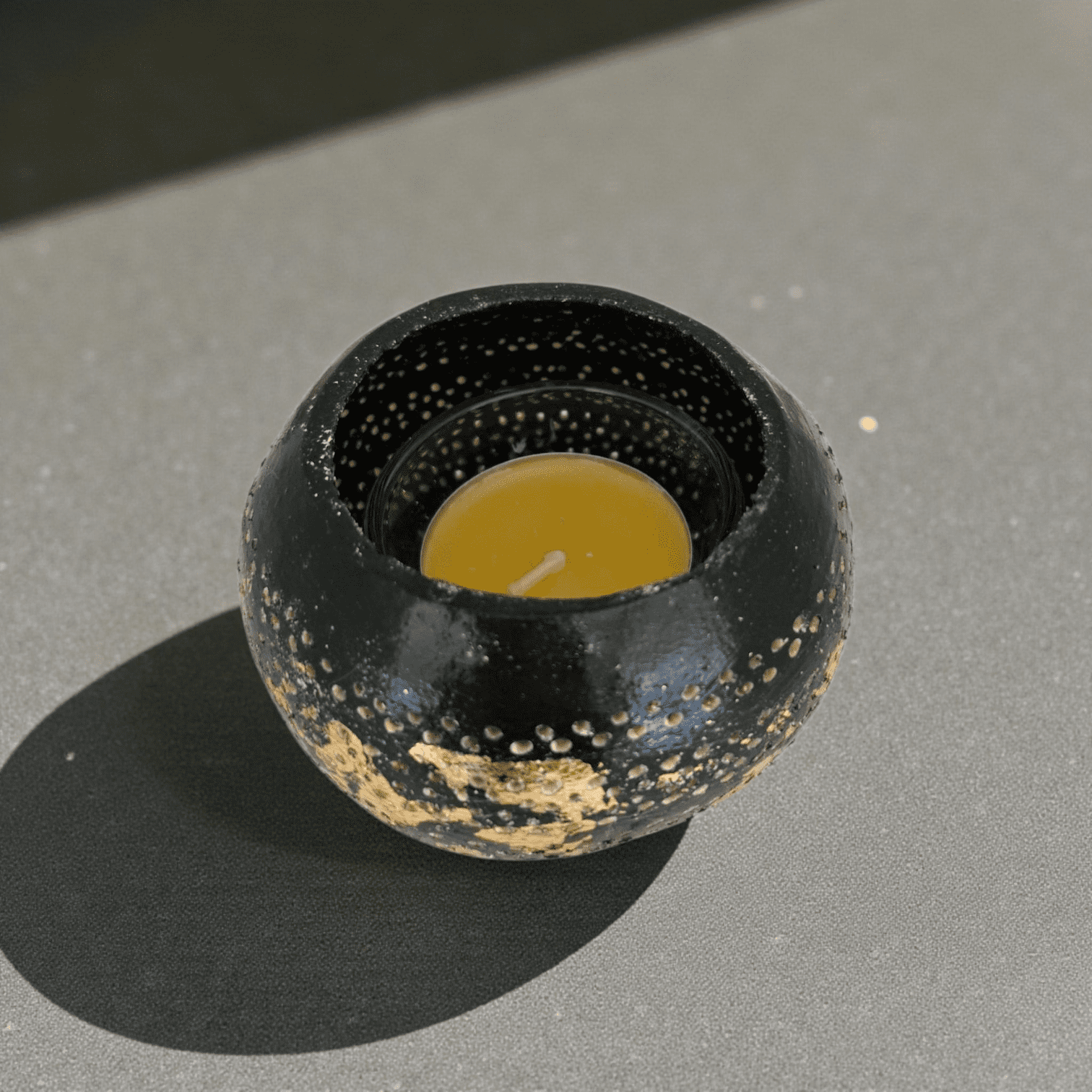 Les trous, percés un par un à l'aide d'une perceuse de précision, permettent à la lumière de la bougie de créer une ambiance douce et onirique.