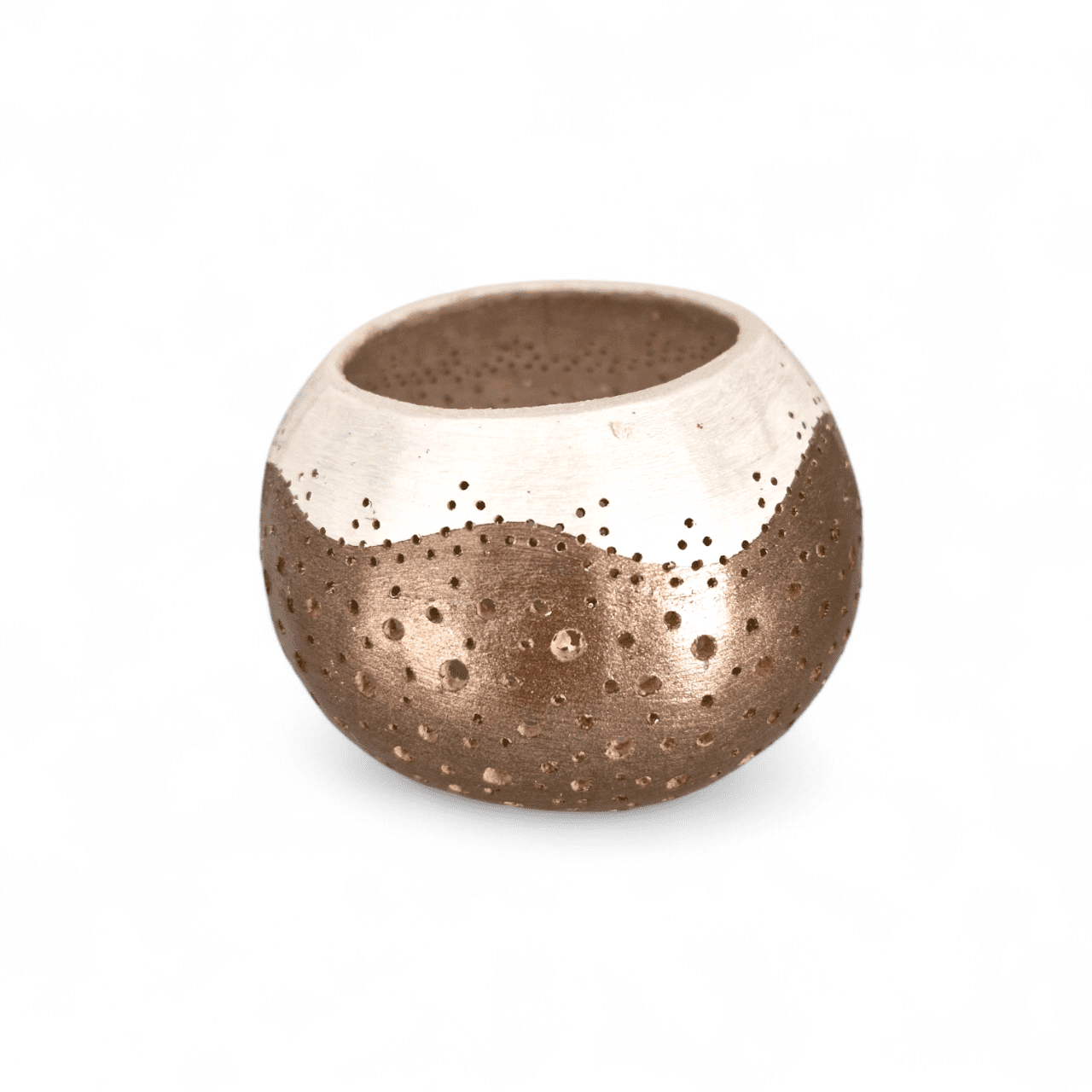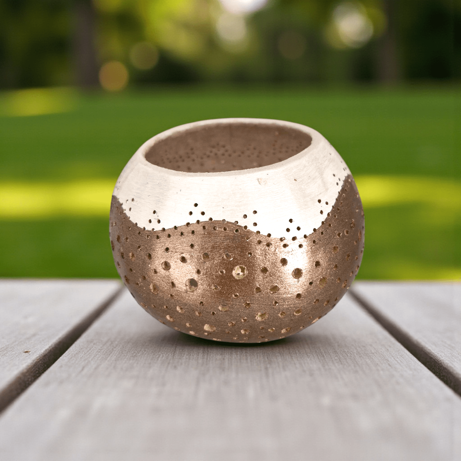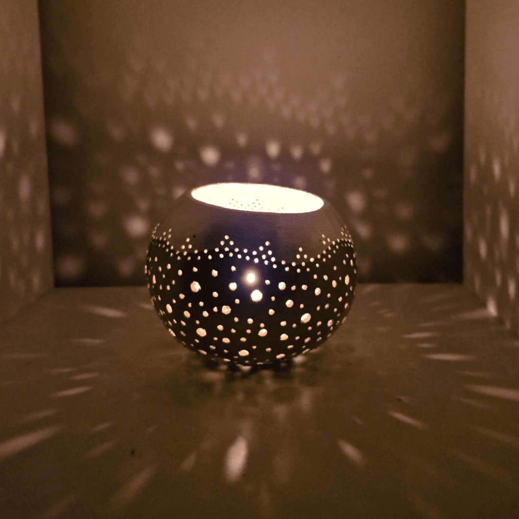 Les trous, percés un par un à l'aide d'une perceuse de précision, permettent à la lumière de la bougie de créer une ambiance douce et onirique.