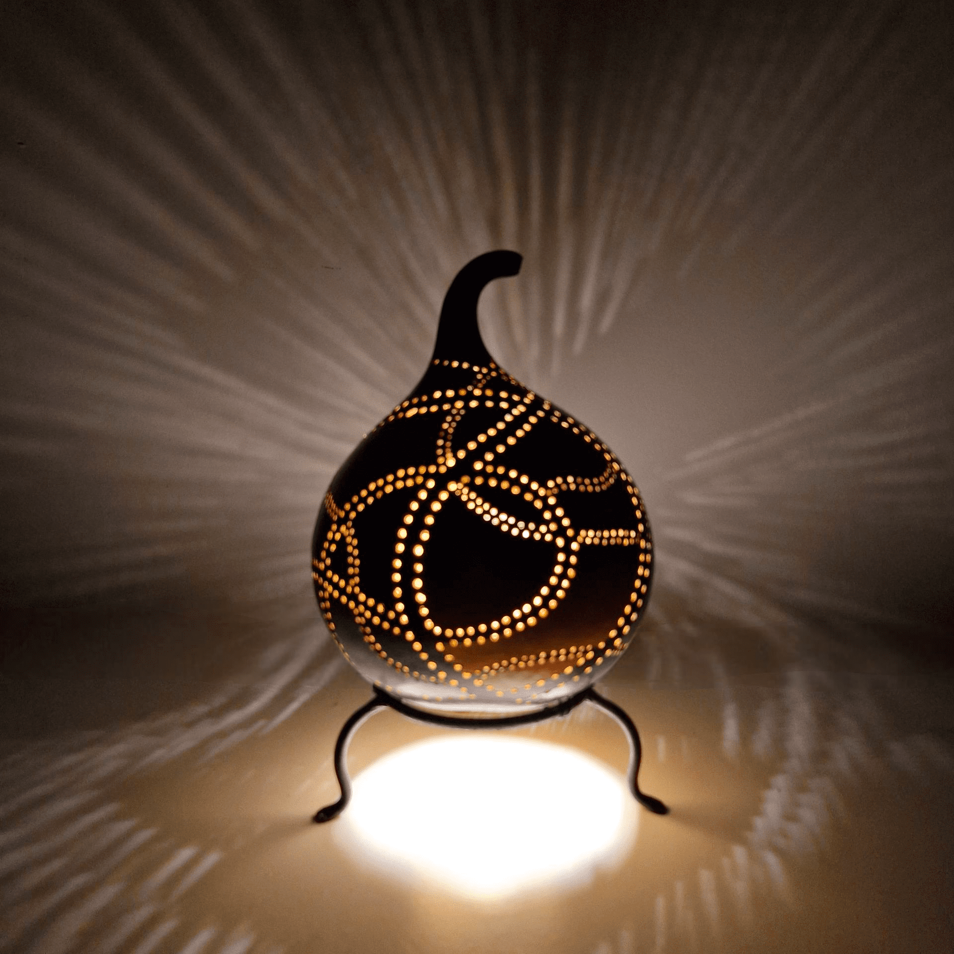 Des centaines de trous de tailles différentes ont été percés sur la gourde à l'aide d'une perceuse de précision afin de laisser passer une lumière douce et onirique.