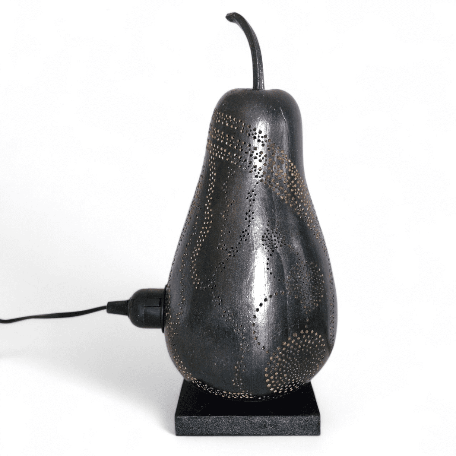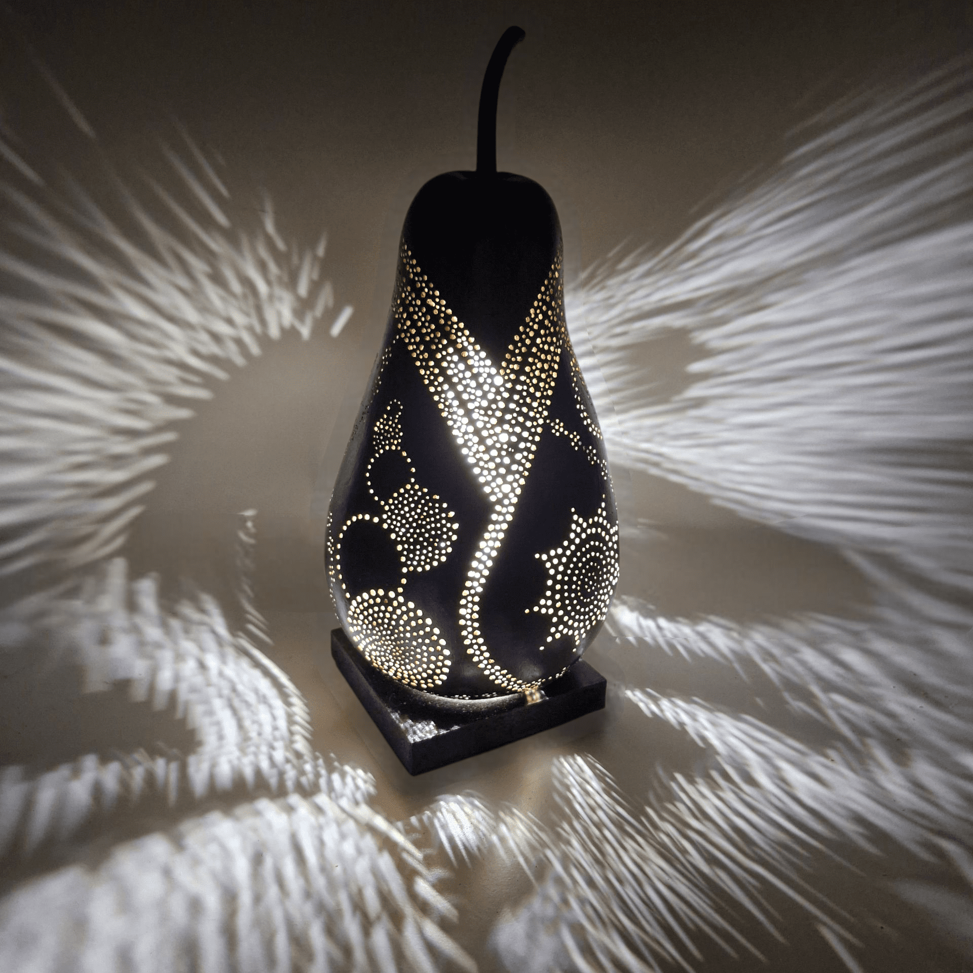 Lampe en gourde-calebasse naturelle nettoyée, poncée, peinte (acrylique noir irisé), puis vernie (Vitrificateur Ultra Brillant).
