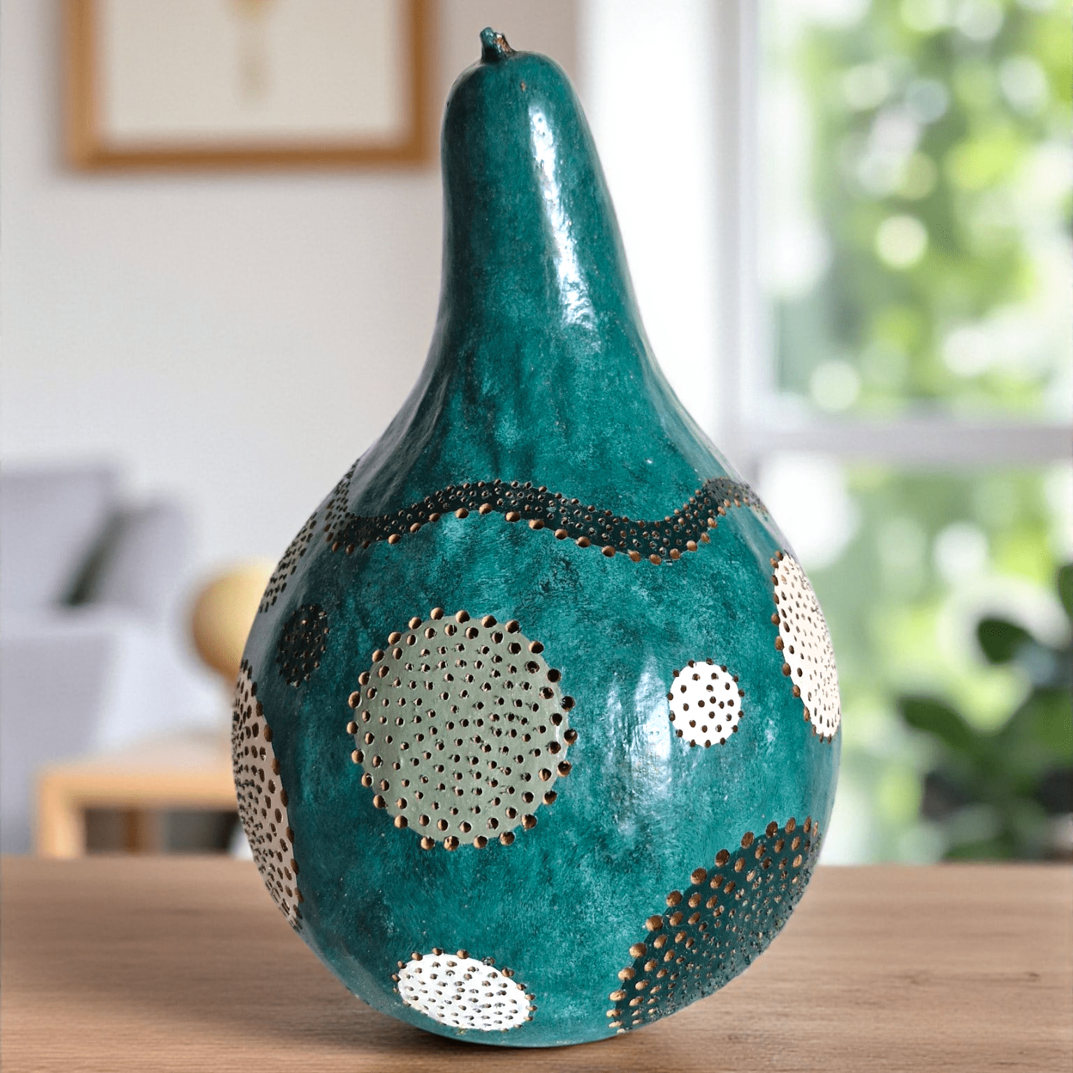 Lampe en gourde-calebasse naturelle vidée, nettoyée, poncée, peinte à la main, puis vernie (Vitrificateur ultra brillant).