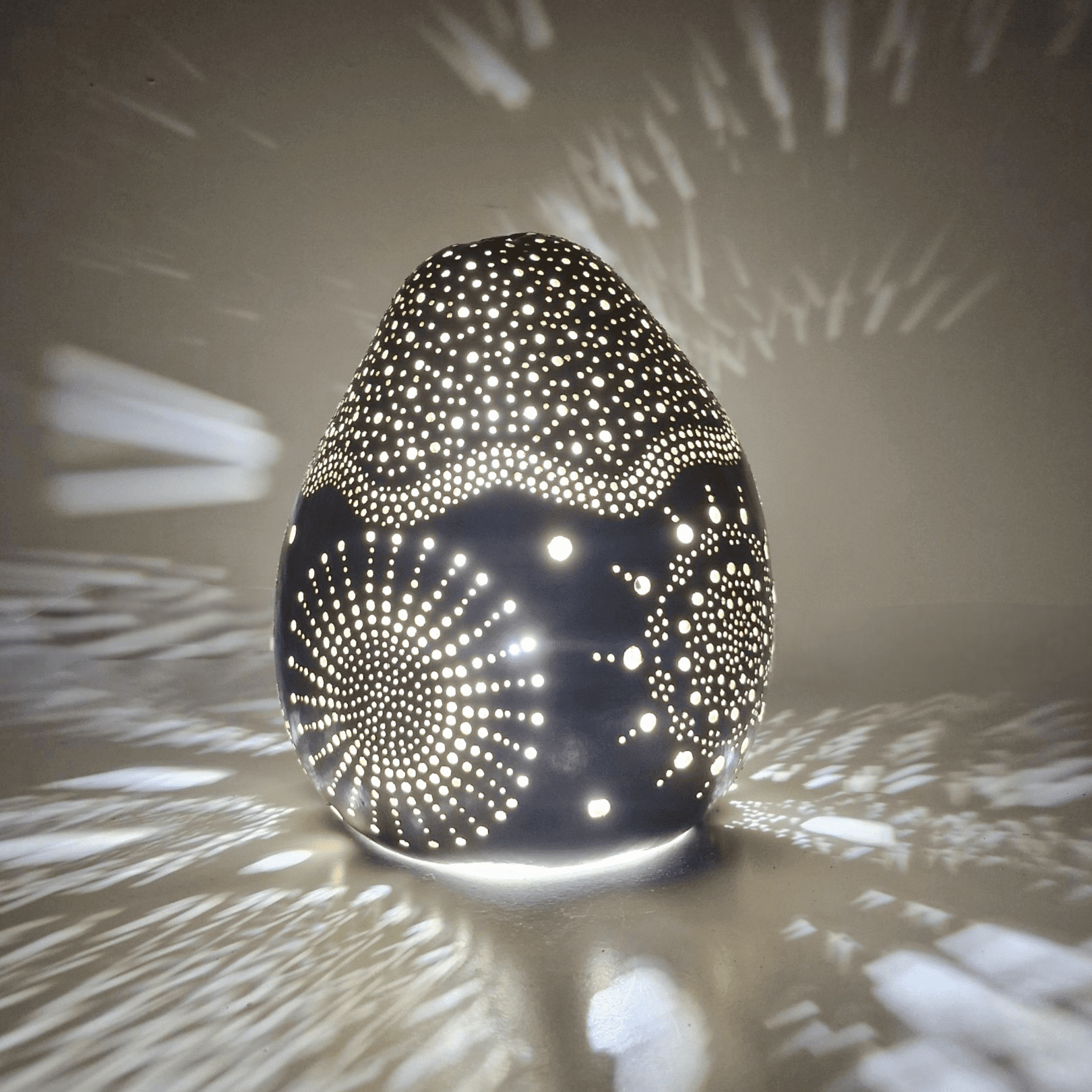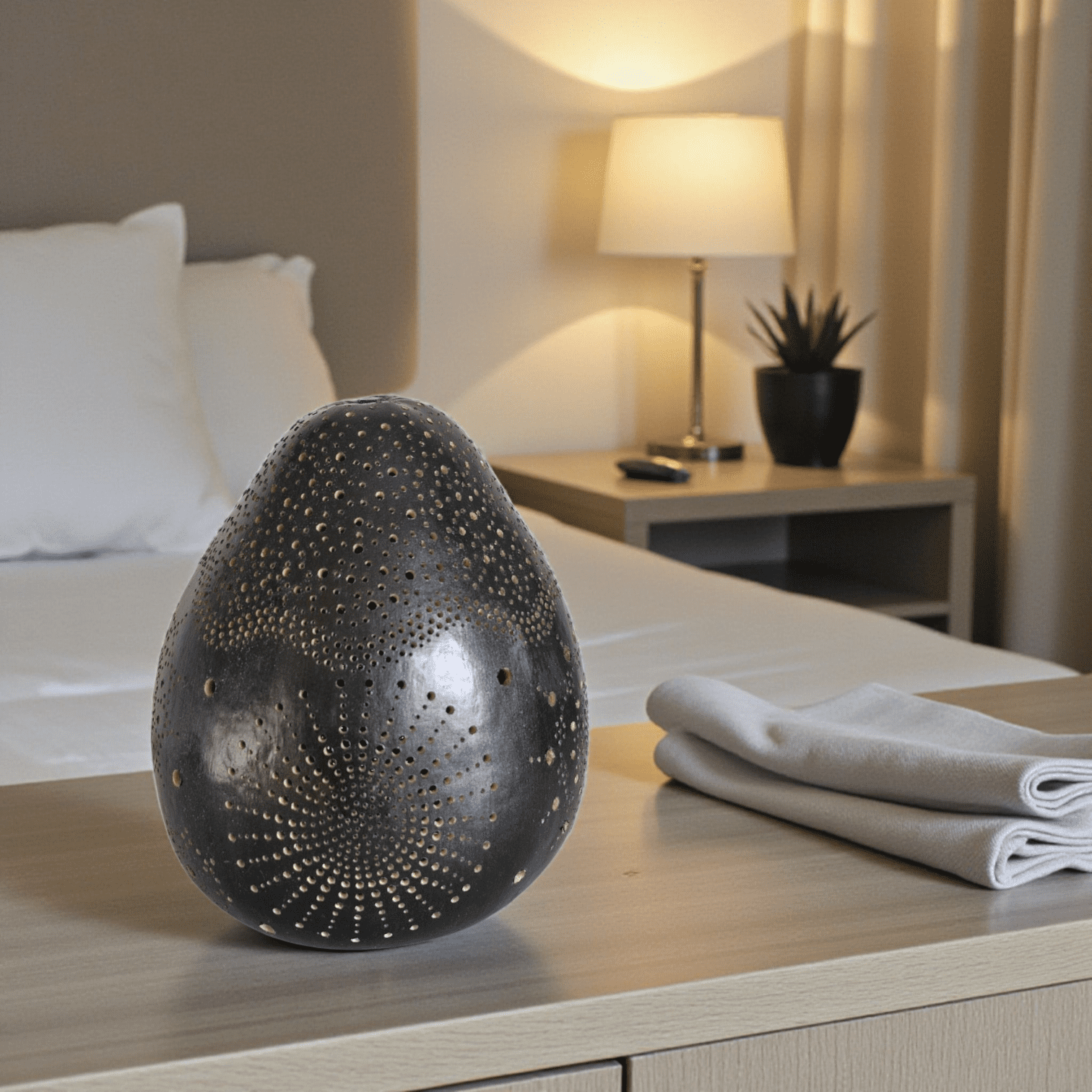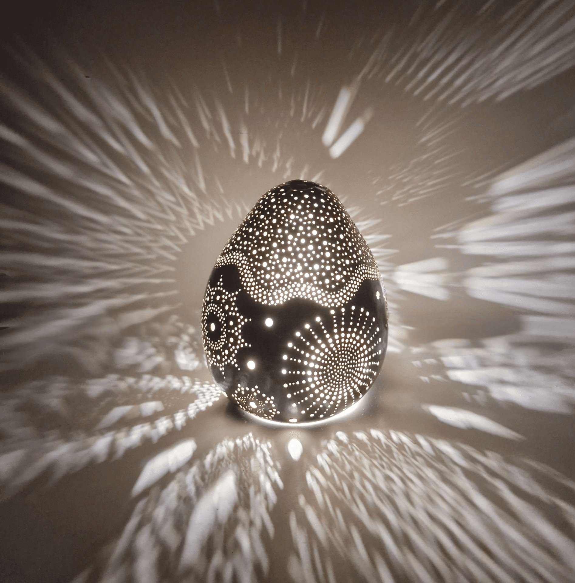 Lumière douce et tamisée qui projette des effets envoûtants sur le mur, grâce aux milliers de trous de différentes tailles percés à l'aide d'une perceuse de précision.