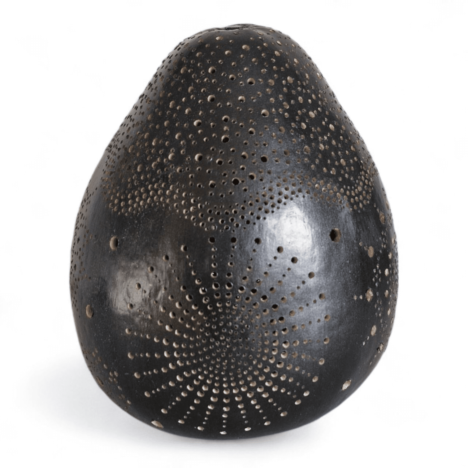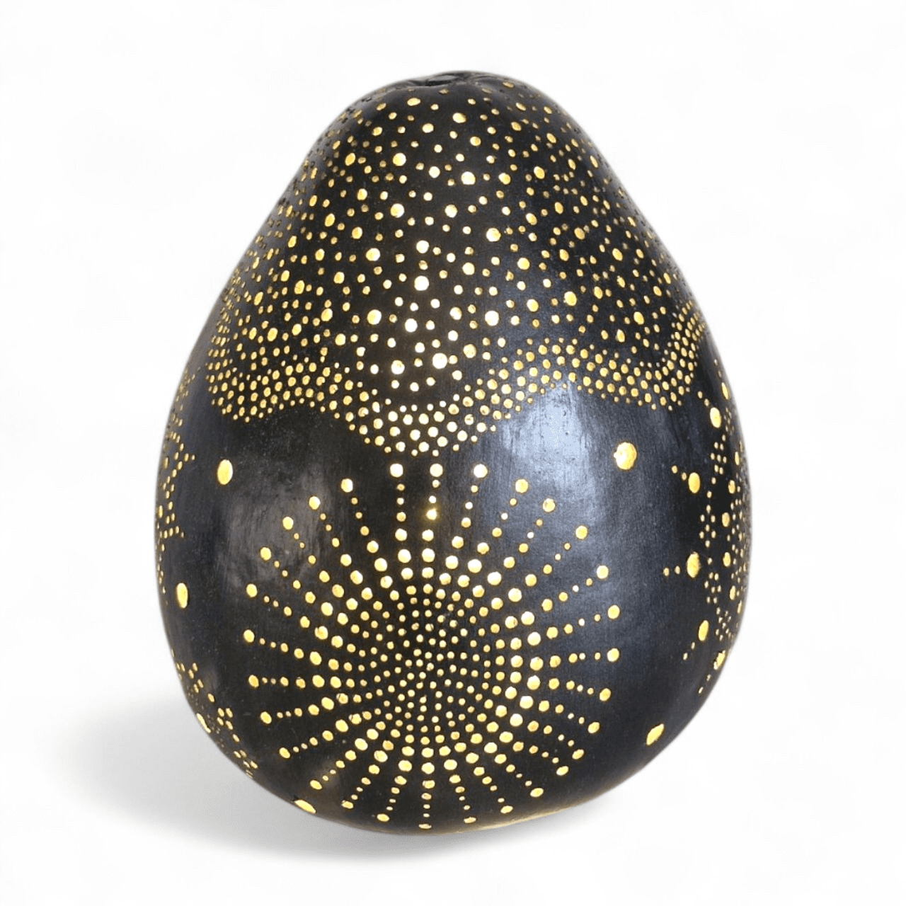 Lampe en gourde-calebasse naturelle nettoyée, poncée, peinte (acrylique noir irisé), puis vernie (Vitrificateur Ultra Brillant).