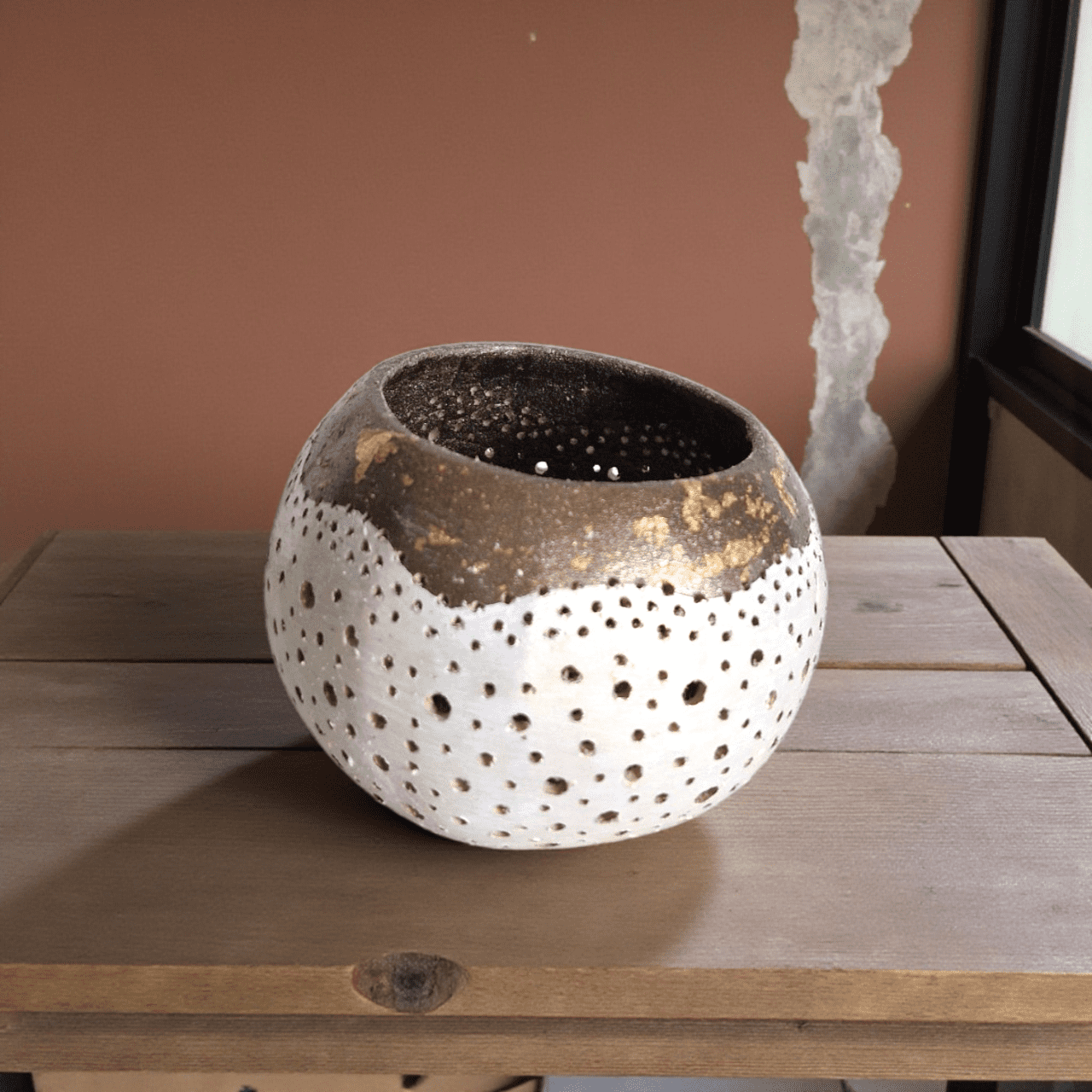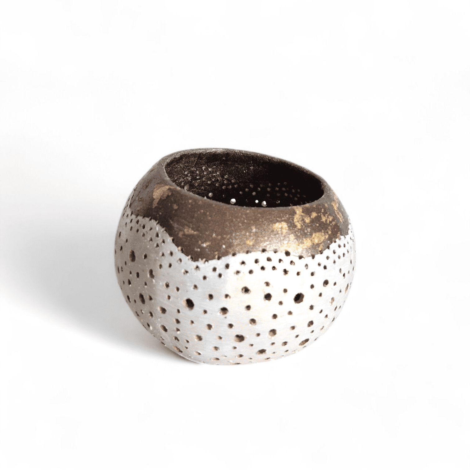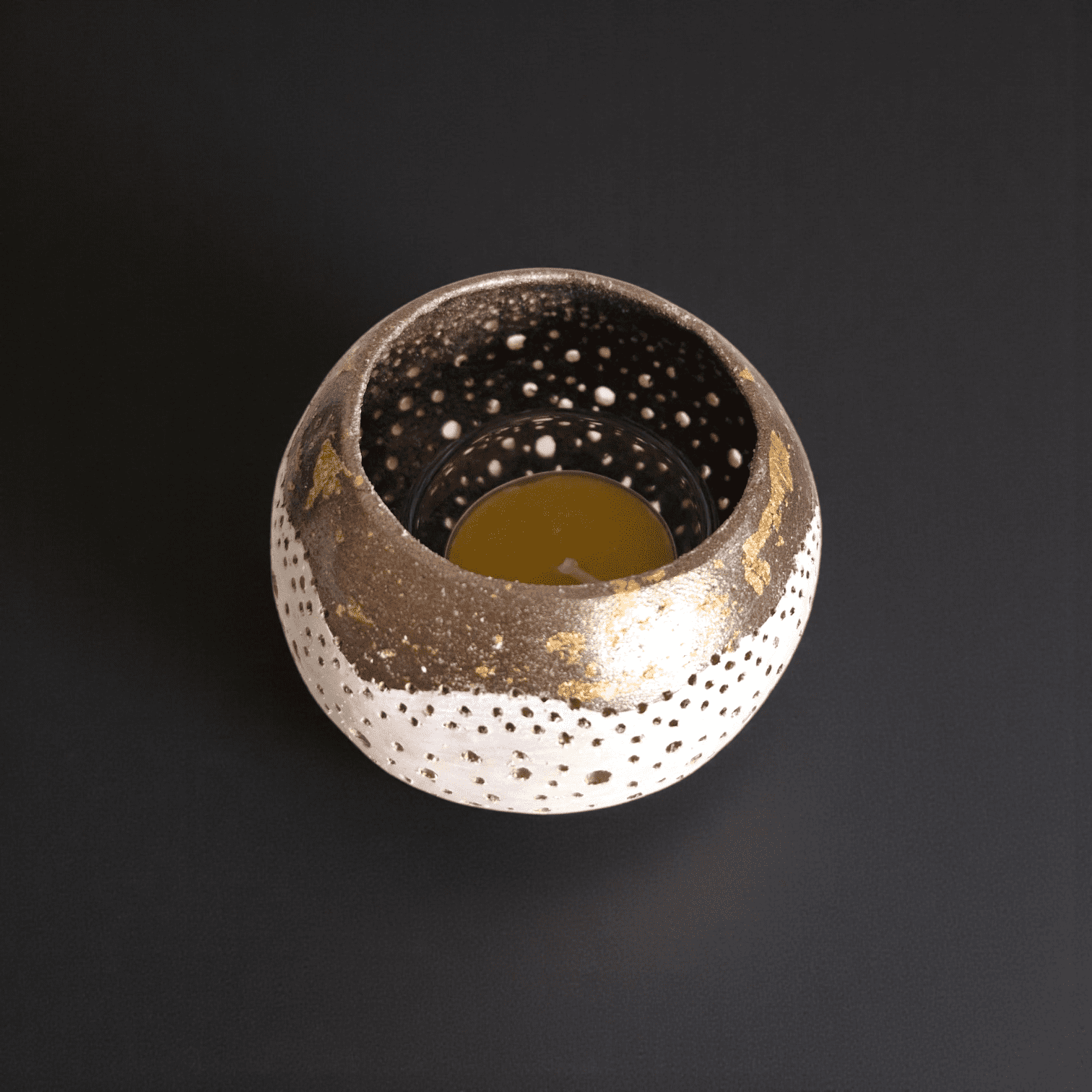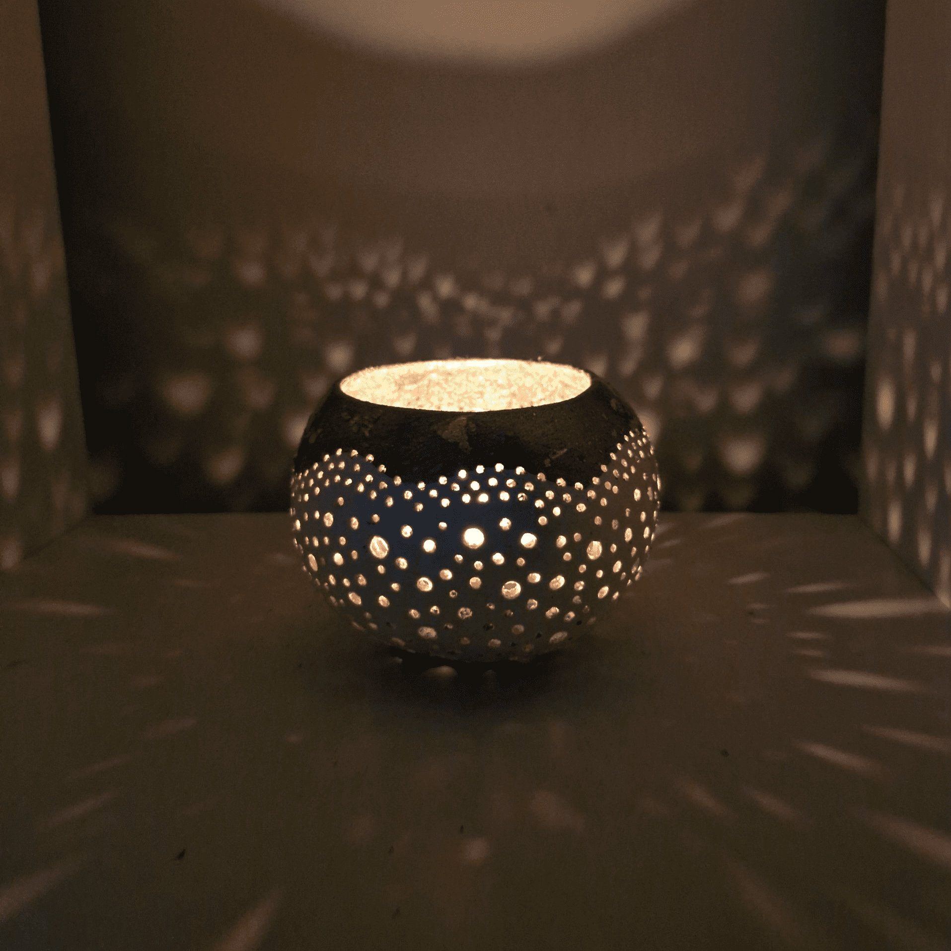 Les trous, percés un par un à l'aide d'une perceuse de précision, permettent à la lumière de la bougie de créer une ambiance douce et onirique.