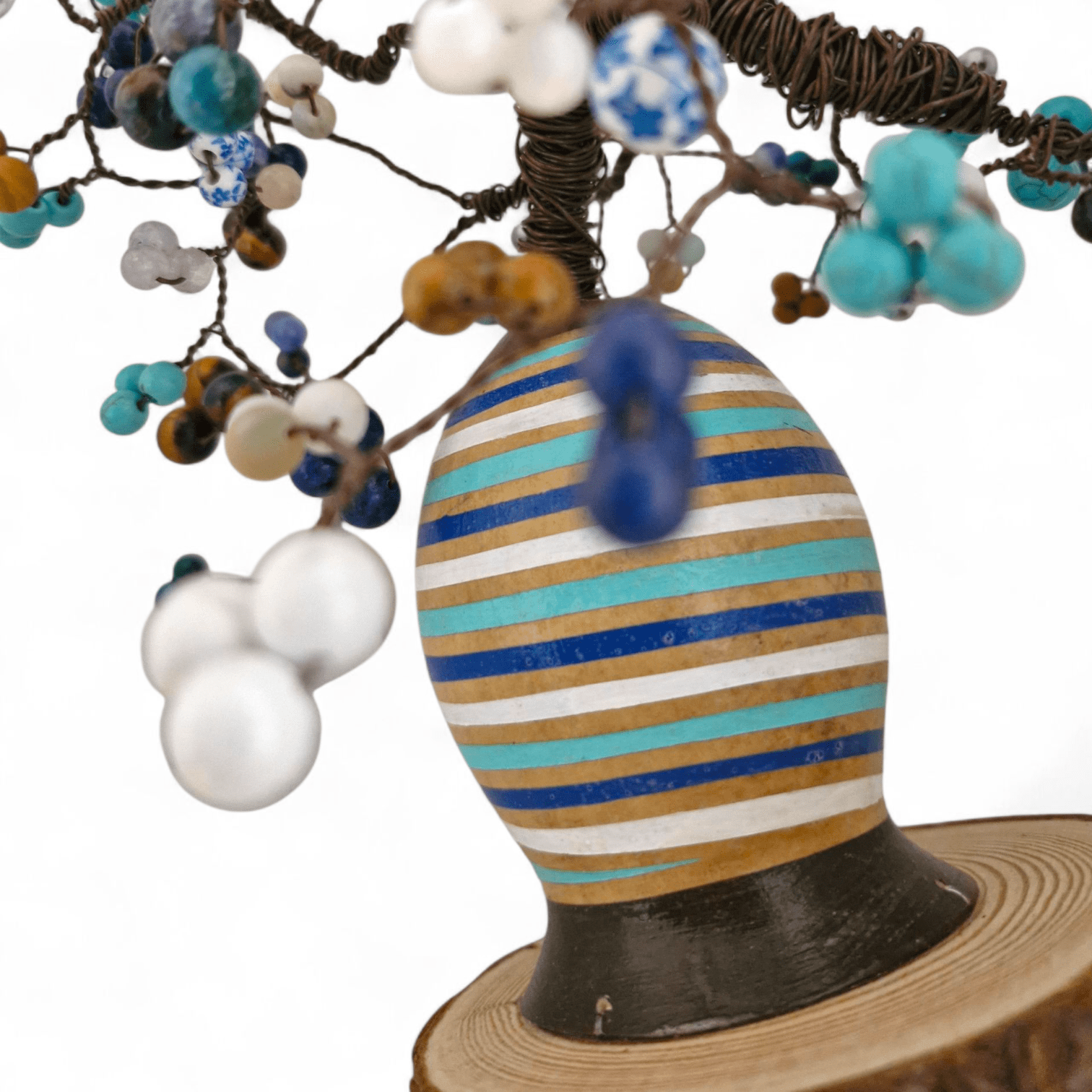 - Tronc en gourde-calebasse naturelle vidée, nettoyée, poncé, peinte à la main (acrylique + verni ultra-brillant), avec ajout de feuilles d'or.
